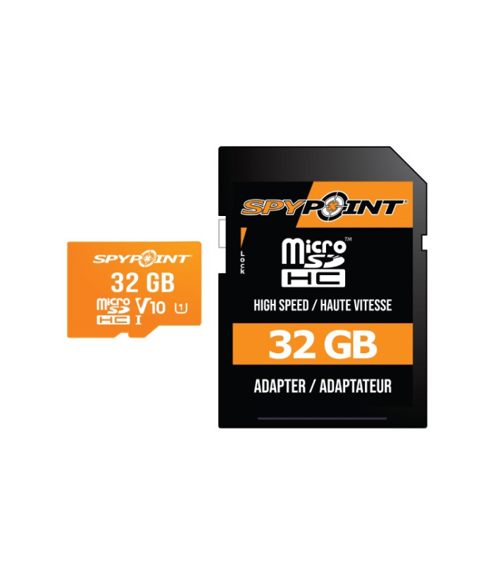 Assurez-vous de disposer de la bonne capacité de stockage et d’enregistrement d’images avec la carte microSD 32 Go ultrahaute vitesse de SPYPOINT. La carte de classe 10 vous fournit le rendement désiré pour prendre les meilleures photos possible et, avec sa capacité de stockage de 32 Go, vous évite de courir à votre site de chasse remplacer vos cartes SD.