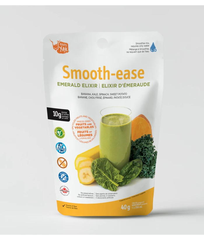 Découvrez Smooth-Ease Élixir Émeraude Happy Yak - un mélange revitalisant de banane, de chou frisé, d'épinards et de patate douce, conçu à partir de fruits et légumes recyclés et lyophilisés pour préserver leur saveur naturelle et leurs valeurs nutritives. Cet élixir riche en nutriments est à la fois délicieux et respectueux de l'environnement.