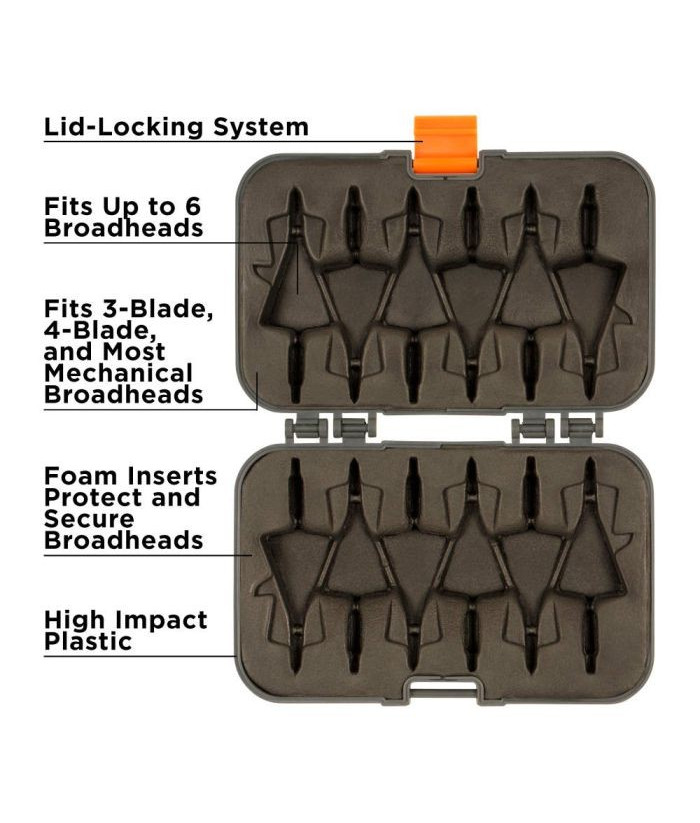 La Titan Broadhead Box & Caddy d'Allen Company est conçue pour ranger et protéger en toute sécurité jusqu'à six pointes, quel que soit leur type. Grâce à sa coque en plastique robuste et résistant aux chocs, à sa doublure en mousse souple et à son système de verrouillage du couvercle, vous pouvez conserver les pointes à 3 ou 4 lames, les pointes fixes et les pointes mécaniques en parfait état.